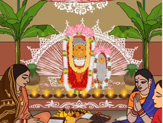 On Wednesday Morning, the women who are in fasting, they clean the place where they worship.As per the rituals of the Budhibaman osha some elements flower of different colours, fruits, incense stick, durba grass, turmeric powder, gua(betel nut), kalash, seven grains,gangajal, rice grains, kaudi ( conch), coconut, red cloth(salu kana) sankha bangles